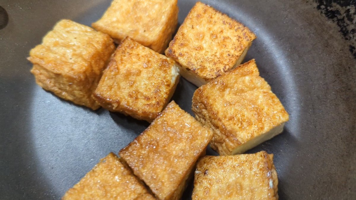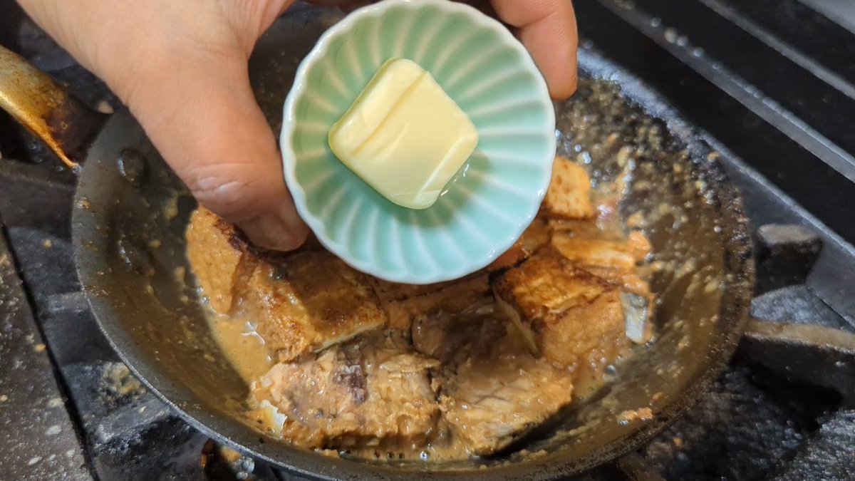 厚揚げを香ばしく焼いて!鯖の味噌煮缶と一緒に煮絡めて、仕上げにバターを溶かして絡めたら絶品おつまみ完成