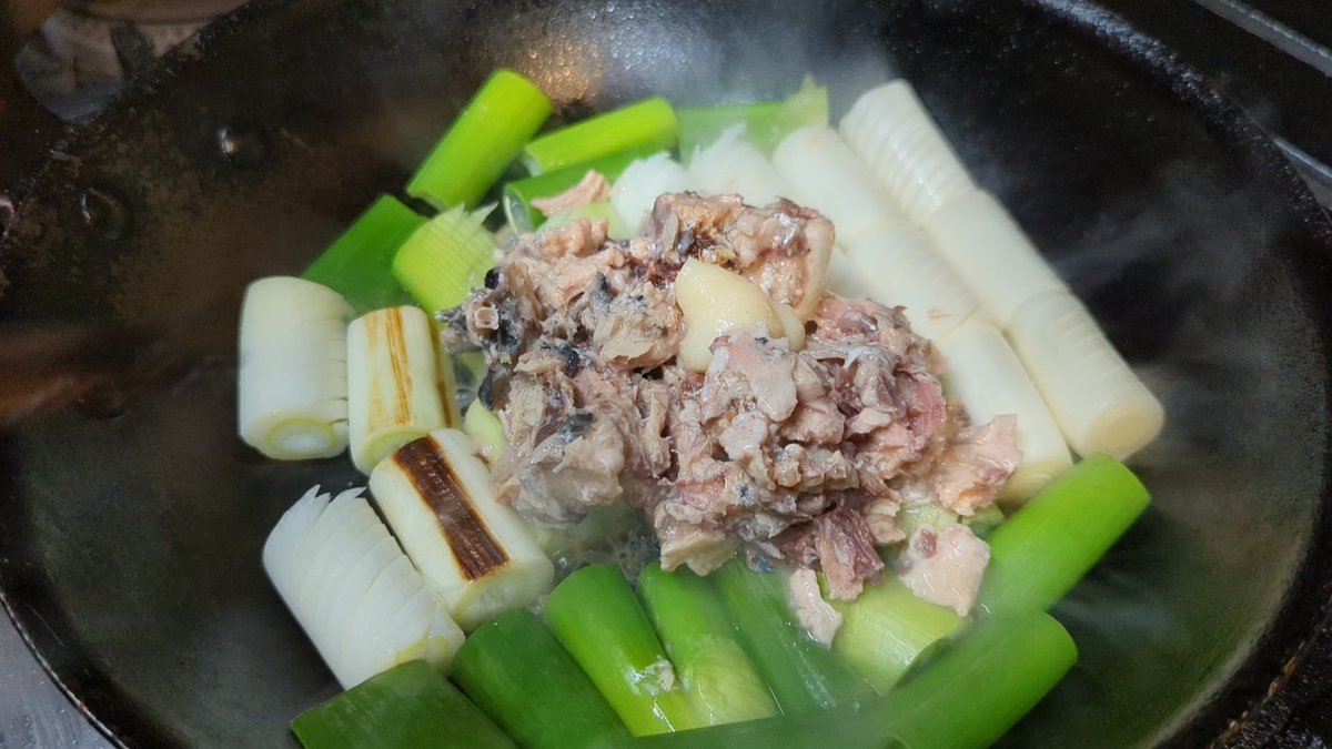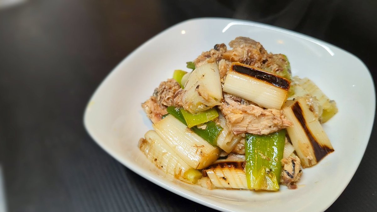 白葱を香ばしく焼いたら鯖缶加えて