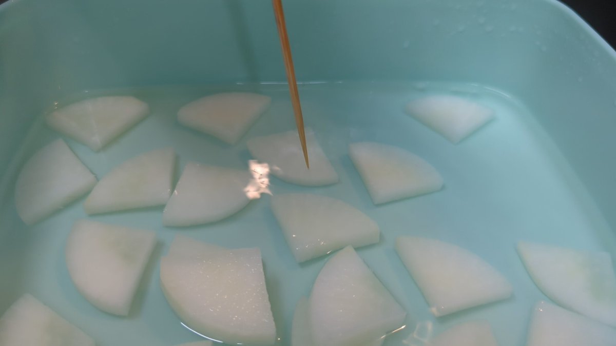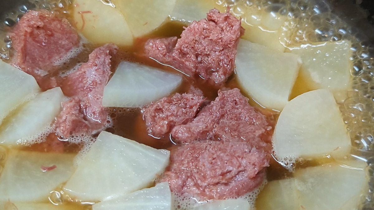 大根をレンジで下茹でしたら、コンビーフ・麺つゆと一緒に煮込むだけで