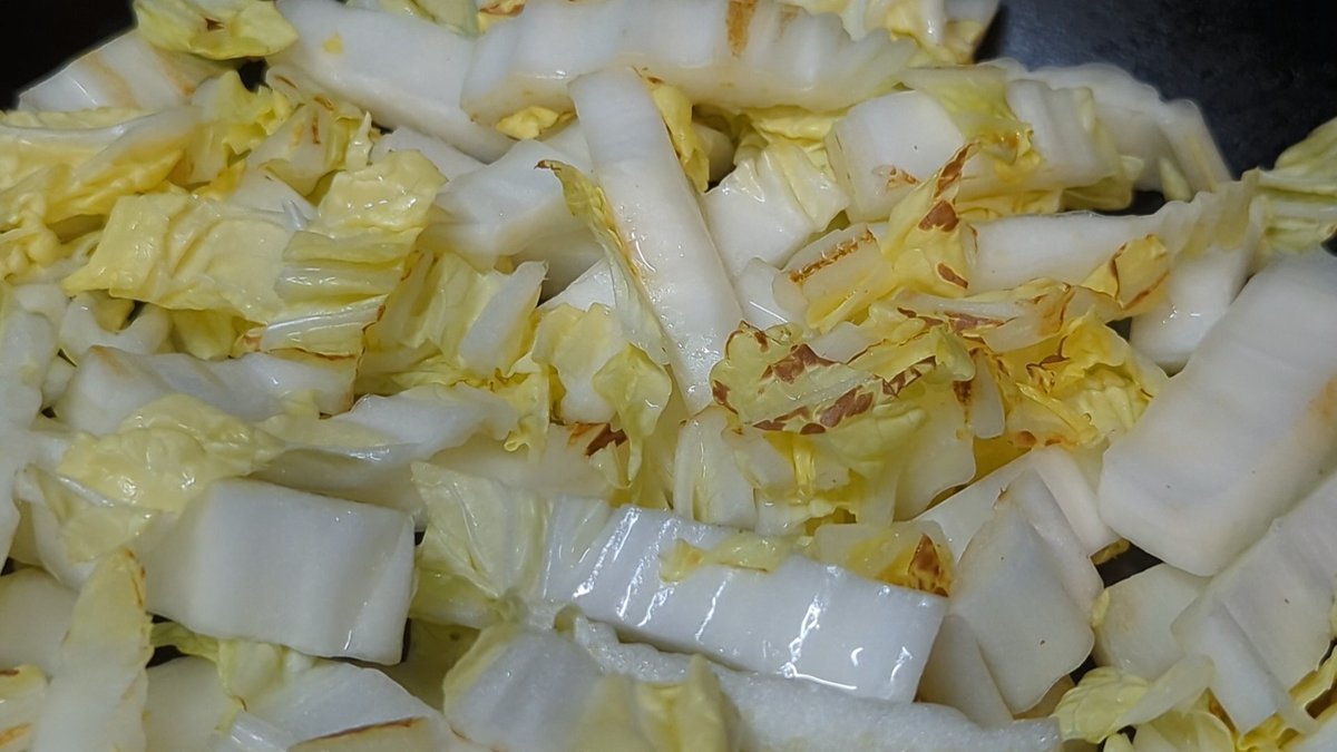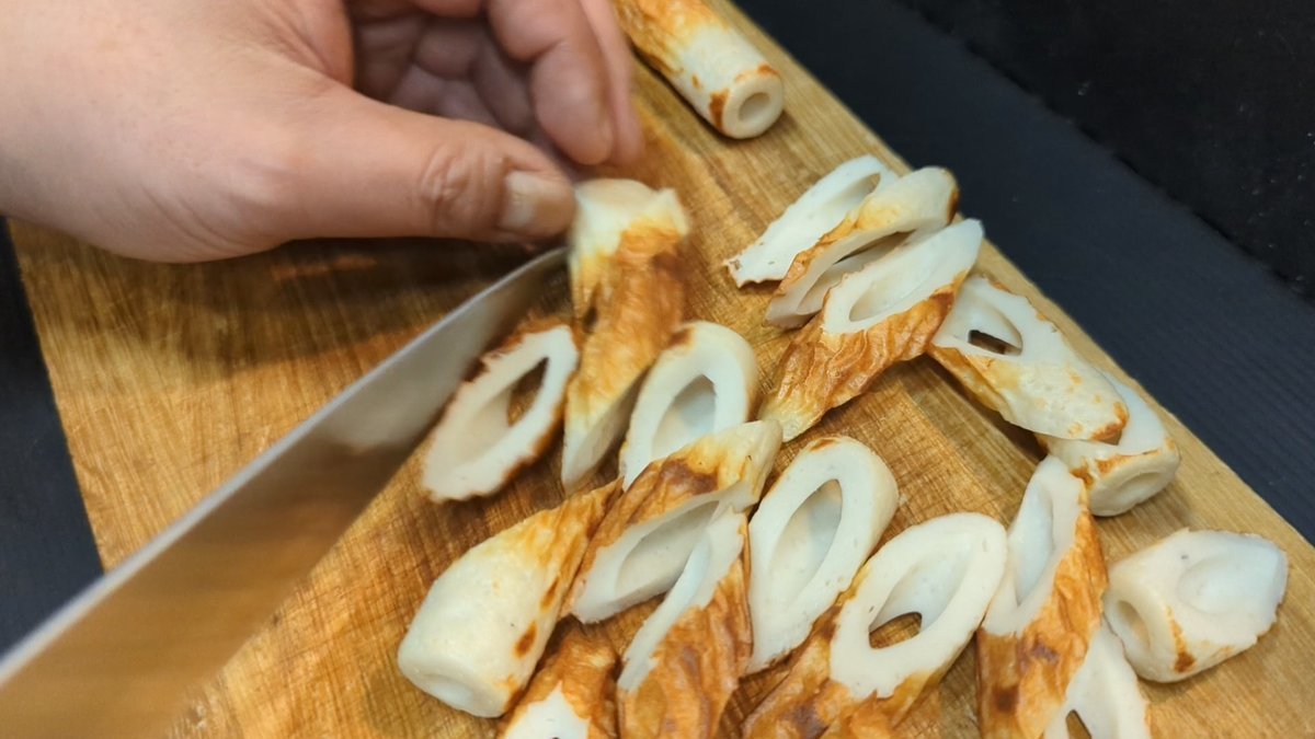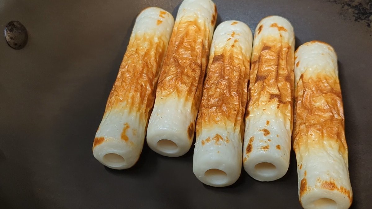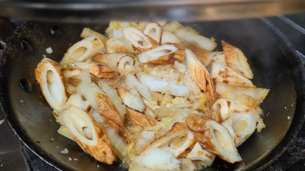 ちくわの表面を香ばしく焼き直し、白菜の表面を軽く焼き焦がしてから